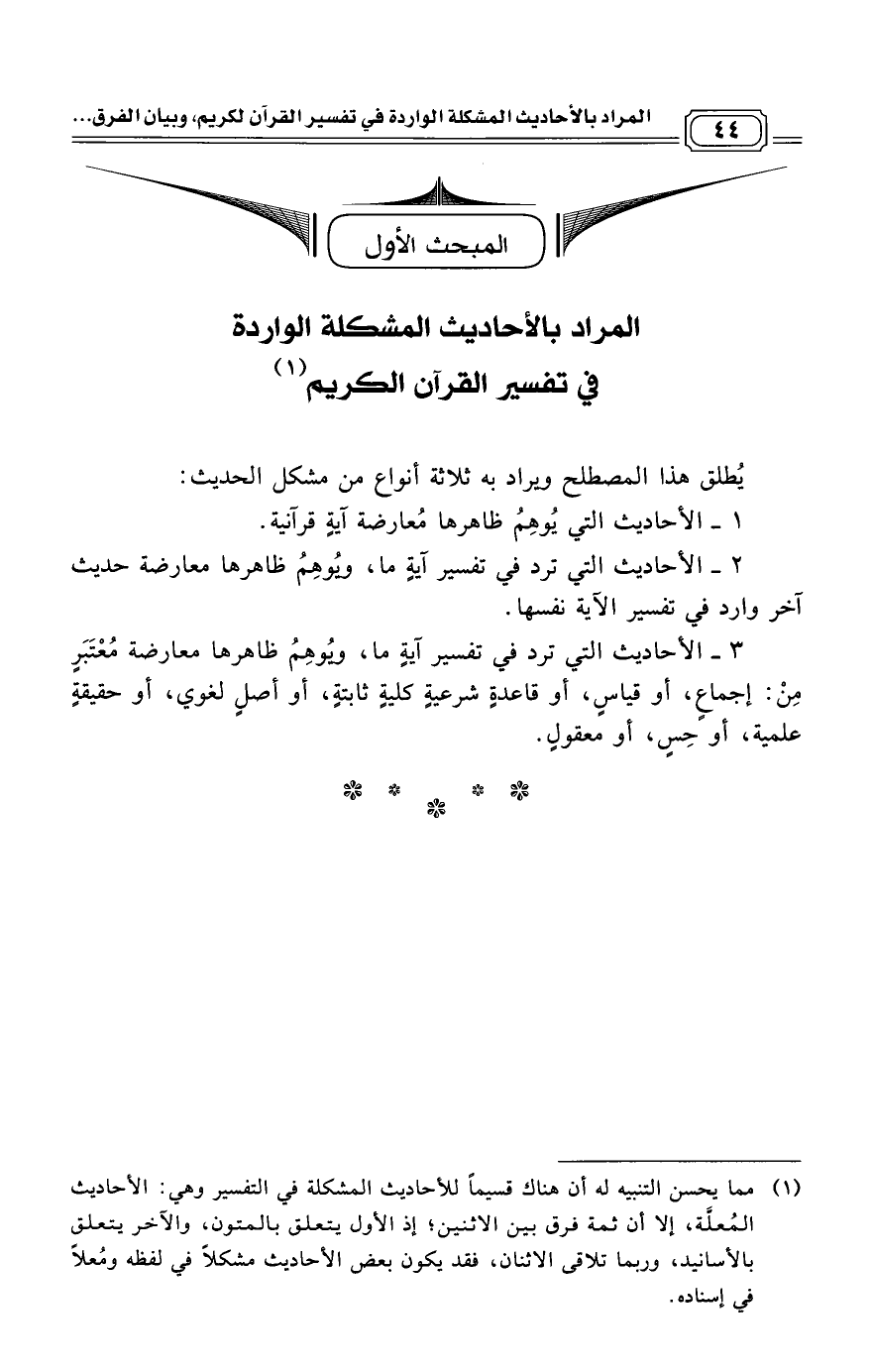 (¬1) مما يحسن التنبيه له أن هناك قسيماً للأحاديث المشكلة في التفسير وهي: الأحاديث المُعلَّة، إلا أن ثمة فرق بين الاثنين؛ إذ الأول يتعلق بالمتون، والآخر يتعلق بالأسانيد، وربما تلاقى الاثنان، فقد يكون بعض الأحاديث مشكلاً في لفظه ومُعلاً في إسناده.