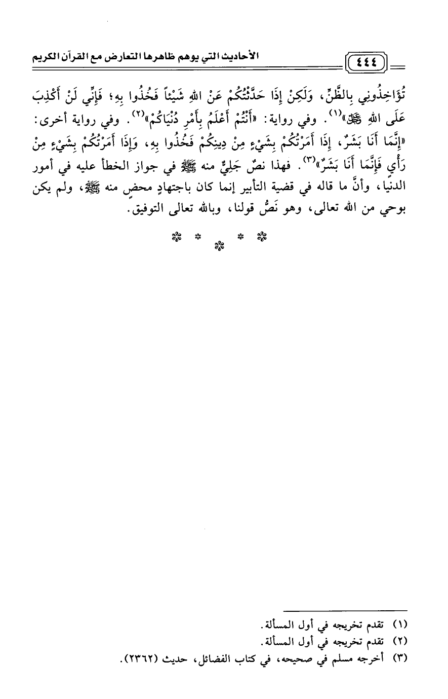 تُؤَاخِذُونِي بِالظَّنِّ، وَلَكِنْ إِذَا حَدَّثْتُكُمْ عَنْ اللَّهِ شَيْئًا فَخُذُوا بِهِ؛ فَإِنِّي لَنْ أَكْذِبَ عَلَى اللَّهِ عَزَّ وَجَلَّ". (¬1) وفي رواية: "أَنْتُمْ أَعْلَمُ بِأَمْرِ دُنْيَاكُمْ". (¬2) وفي رواية أخرى: "إِنَّمَا أَنَا بَشَرٌ، إِذَا أَمَرْتُكُمْ بِشَيْءٍ مِنْ دِينِكُمْ فَخُذُوا بِهِ، وَإِذَا أَمَرْتُكُمْ بِشَيْءٍ مِنْ رَأْيٍ فَإِنَّمَا أَنَا بَشَرٌ". (¬3) فهذا نصٌ جَلِيٌّ منه - صلى الله عليه وسلم - في جواز الخطأ عليه في أمور الدنيا، وأنَّ ما قاله في قضية التأبير إنما كان باجتهادٍ محضٍ منه - صلى الله عليه وسلم -، ولم يكن بوحي من الله تعالى، وهو نَصُّ قولنا، وبالله تعالى التوفيق.