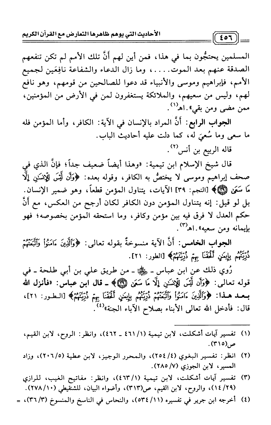 الجواب الرابع: أَنَّ المراد بالإنسان في الآية: الكافر، وأما المؤمن فله ما سعى وما سُعيَ له، كما دلت عليه أحاديث الباب.