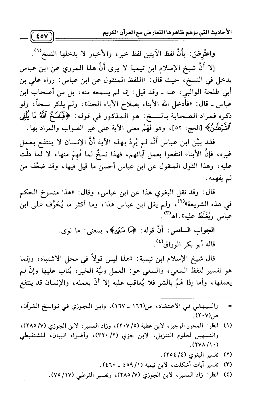 فقد بيَّن ابن عباس أَنَّه لم يُرِدْ بهذه الآية أَنَّ الإنسان لا ينتفع بعمل غيره، فإنَّ الأبناء انتفعوا بعمل آبائهم، فهذا نسخٌ لما فُهِمَ منها، لا لما دلَّت عليه، وهذا القول المنقول عن ابن عباس أحسن ما قيل فيها، وقد ضعَّفه من لم يفهمه.