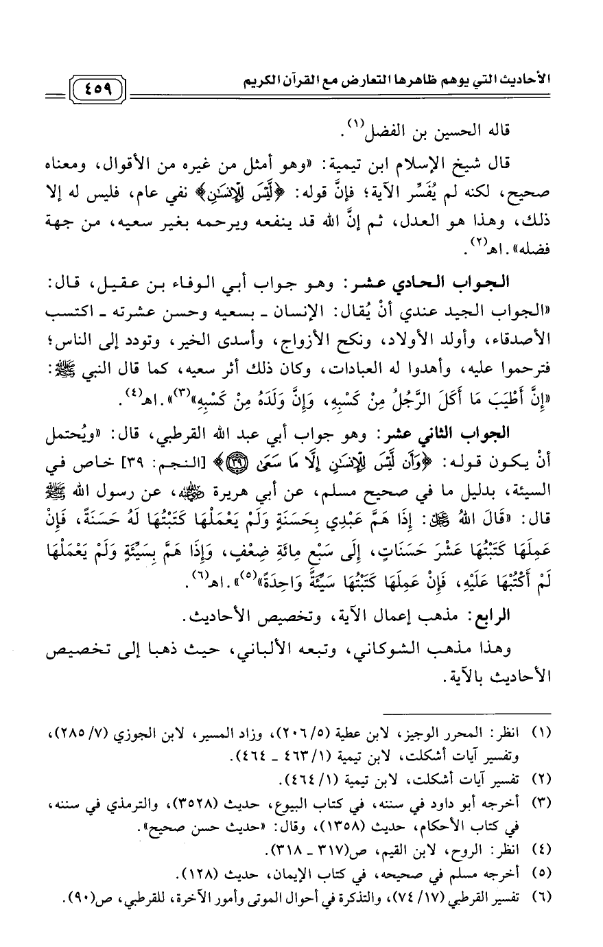 الجواب الثاني عشر: وهو جواب أبي عبد الله القرطبي، قال: "ويُحتمل أنْ يكون قوله: (وَأَنْ لَيْسَ لِلْإِنْسَانِ إِلَّا مَا سَعَى (39)) [النجم: 39] خاص في السيئة، بدليل ما في صحيح مسلم، عن أبي هريرة - رضي الله عنه -، عن رسول الله - صلى الله عليه وسلم - قال: "قَالَ اللَّهُ عَزَّ وَجَلَّ: إِذَا هَمَّ عَبْدِي بِحَسَنَةٍ وَلَمْ يَعْمَلْهَا كَتَبْتُهَا لَهُ حَسَنَةً، فَإِنْ عَمِلَهَا كَتَبْتُهَا عَشْرَ حَسَنَاتٍ، إِلَى سَبْعِ مِائَةِ ضِعْفٍ، وَإِذَا هَمَّ بِسَيِّئَةٍ وَلَمْ يَعْمَلْهَا لَمْ أَكْتُبْهَا عَلَيْهِ، فَإِنْ عَمِلَهَا كَتَبْتُهَا سَيِّئَةً وَاحِدَةً". (¬7) ". اهـ (¬8)