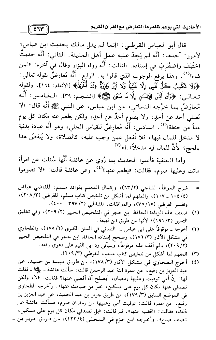 قال أبو العباس القرطبي: "إنما لم يقل مالك بحديث ابن عباس؛ لأمور: أحدها: أَنَّه لم يَجِدْ عليه عمل أهل المدينة. الثاني: أَنَّه حديثٌ اختُلِفَ واضطُرِبَ في إسناده. الثالث: أَنَّه رواه البزار وقال في آخره: "لمن شاء" (¬1). وهذا يرفع الوجوب الذي قالوا به. الرابع: أَنَّه مُعارضٌ بقوله تعالى: (وَلَا تَكْسِبُ كُلُّ نَفْسٍ إِلَّا عَلَيْهَا وَلَا تَزِرُ وَازِرَةٌ وِزْرَ أُخْرَى) [الأنعام: 164]، ولقوله تعالى: (وَأَنْ لَيْسَ لِلْإِنْسَانِ إِلَّا مَا سَعَى (39)) [النجم: 39]. الخامس: أَنَّه مٌعارَضٌ بما خرَّجه النسائي، عن ابن عباس، عن النبي - صلى الله عليه وسلم - أَنَّه قال: "لا يُصلي أحد عن أحدٍ، ولا يصوم أحدٌ عن أحدٍ، ولكن يطعم عنه مكان كل يوم مداً من حنطة" (¬2). السادس: أَنَّه مُعارِضٌ للقياس الجلي، وهو أَنَّه عبادة بدنية لا مدخل للمال فيها، فلا تُفعل عمن وجب عليه، كالصلاة، ولا يُنقضُ هذا بالحج؛ لأَنَّ للمال فيه مدخلاً". اهـ (¬3)