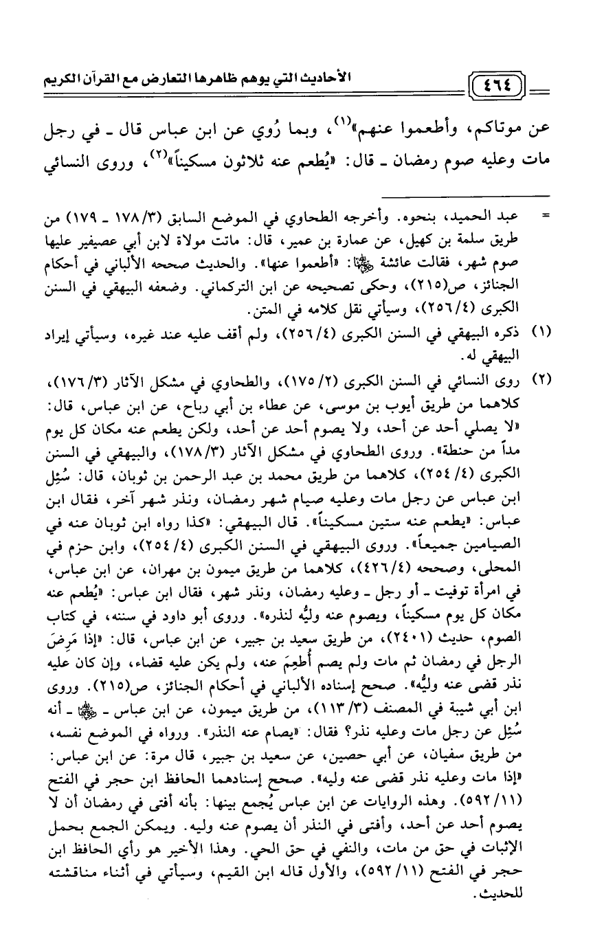 (¬2) روى النسائي في السنن الكبرى (2/ 175)، والطحاوي في مشكل الآثار (3/ 176)، كلاهما من طريق أيوب بن موسى، عن عطاء بن أبي رباح، عن ابن عباس، قال: "لا يصلي أحد عن أحد، ولا يصوم أحد عن أحد، ولكن يطعم عنه مكان كل يوم مداً من حنطة".