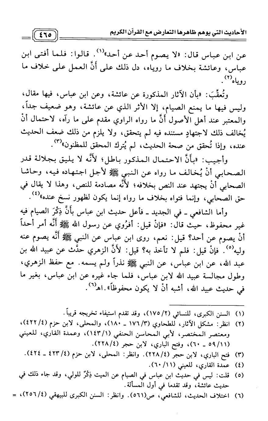 وتُعقِّبَ: "بأن الآثار المذكورة عن عائشة، وعن ابن عباس، فيها مقال، وليس فيها ما يمنع الصيام، إلا الأثر الذي عن عائشة، وهو ضعيف جداً، والمعتبر عند أهل الأصول أَنَّ ما رواه الراوي مقدم على ما رآه، لاحتمال أنْ يُخالف ذلك لاجتهادٍ مستنده فيه لم يتحقق، ولا يلزم من ذلك ضعف الحديث عنده، وإذا تُحقق من صحة الحديث، لم يُترك المحقق للمظنون". (¬3)