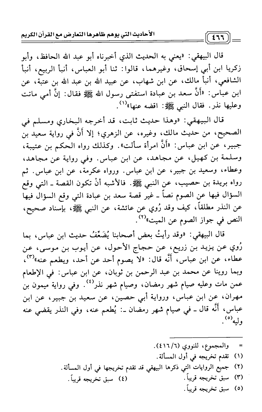 قال البيهقي: "وهذا حديث ثابت، قد أخرجه البخاري ومسلم في الصحيح، من حديث مالك، وغيره، عن الزهري؛ إلا أَنَّ في رواية سعيد بن جبير، عن ابن عباس: "أَنَّ امرأة سألت". وكذلك رواه الحكم بن عتيبة، وسلمة بن كهيل، عن مجاهد، عن ابن عباس. وفي رواية عن مجاهد، وعطاء، وسعيد بن جبير، عن ابن عباس. ورواه عكرمة، عن ابن عباس. ثم رواه بريدة بن حصيب، عن النبي - صلى الله عليه وسلم -. فالأشبه أنْ تكون القصة - التي وقع السؤال فيها عن الصوم نصاً - غير قصة سعد بن عبادة التي وقع السؤال فيها عن النذر مطلقاً، كيف وقد رُوي عن عائشة، عن النبي - صلى الله عليه وسلم -، بإسناد صحيح، النص في جواز الصوم عن الميت". (¬2)