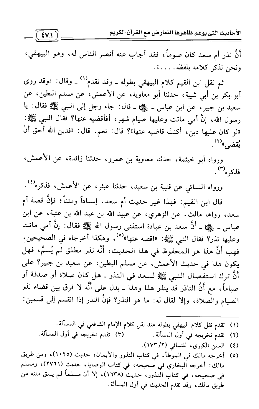 أَنَّ نذر أم سعد كان صوماً، فقد أجاب عنه أنصر الناس له، وهو البيهقي، ونحن نذكر كلامه بلفظه .... ".