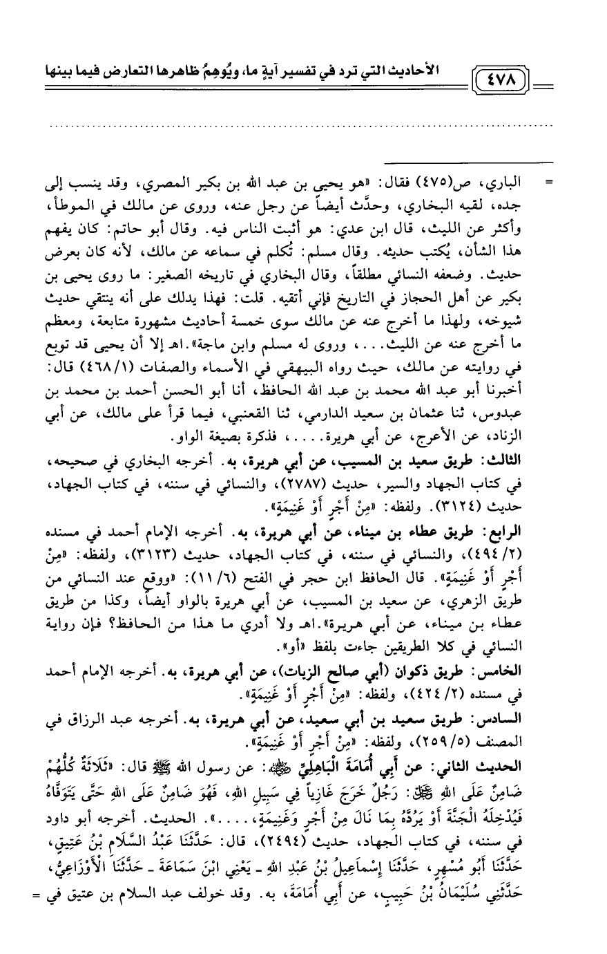 إلا أن يحيى قد توبع في روايته عن مالك، حيث رواه البيهقي في الأسماء والصفات (1/ 468) قال: أخبرنا أبو عبد الله محمد بن عبد الله الحافظ، أنا أبو الحسن أحمد بن محمد بن عبدوس، ثنا عثمان بن سعيد الدارمي، ثنا القعنبي، فيما قرأ على مالك، عن أبي الزناد، عن الأعرج، عن أبي هريرة .... ، فذكرة بصيغة الواو.