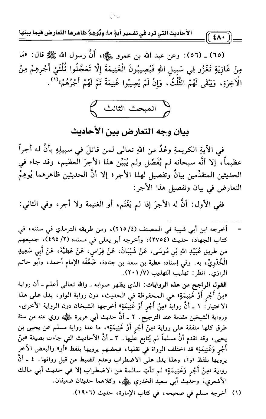 3 - أنَّ الأحاديث التي جاءت بصيغة «مِنْ أَجْرٍ وَغَنِيمَةٍ» قد اختلف الرواة في نقلها، فبعضهم يرويها بلفظ «أو» والبعض الآخر يرويها بلفظ «و»، وهذا يدل على الاضطراب وعدم الضبط من قبل رواتها.