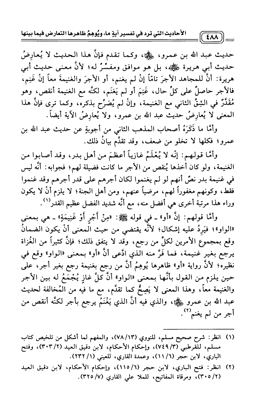 حديث عبد الله بن عمرو، رضي الله عنهما، وكما تقدم فإنَّ هذا الحديث لا يُعارِضُ حديث أبي هريرة رضي الله عنه، بل هو موافق ومفسِّرٌ له؛ لأنَّ معنى حديث أبي هريرة: أنَّ للمجاهد الأجرَ تامّاً إنْ لم يغنم، أو الأجرَ والغنيمةَ معاً إنْ غَنِم، فالأجر حاصلٌ على كلِّ حال، غَنِمَ أو لم يَغنَم، لكنَّه مع الغنيمة أنقص، وهو مُقَدَّرٌ في الشِقِّ الثاني مع الغنيمة، وإنْ لم يُصَرِّح بذكره، وكما ترى فإنَّ هذا المعنى لا يُعارِضُ حديث عبد الله بن عمرو، ولا يُعارِضُ الآية أيضاً.