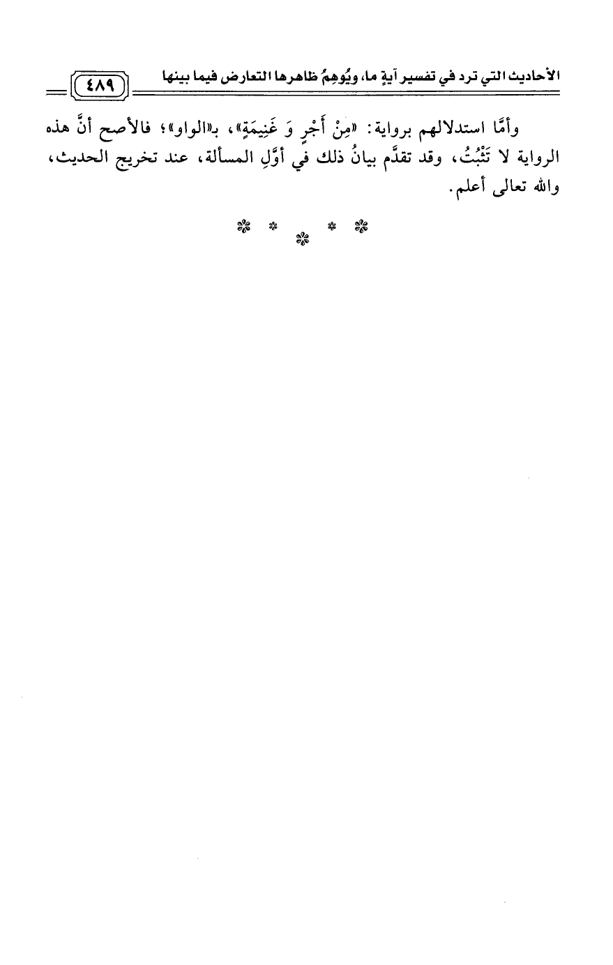 وأمَّا استدلالهم برواية: «مِنْ أَجْرٍ وَغَنِيمَةٍ»، بـ «الواو»؛ فالأصح أنَّ هذه الرواية لا تَثْبُتُ، وقد تقدَّم بيانُ ذلك في أوَّلِ المسألة، عند تخريج الحديث، والله تعالى أعلم.