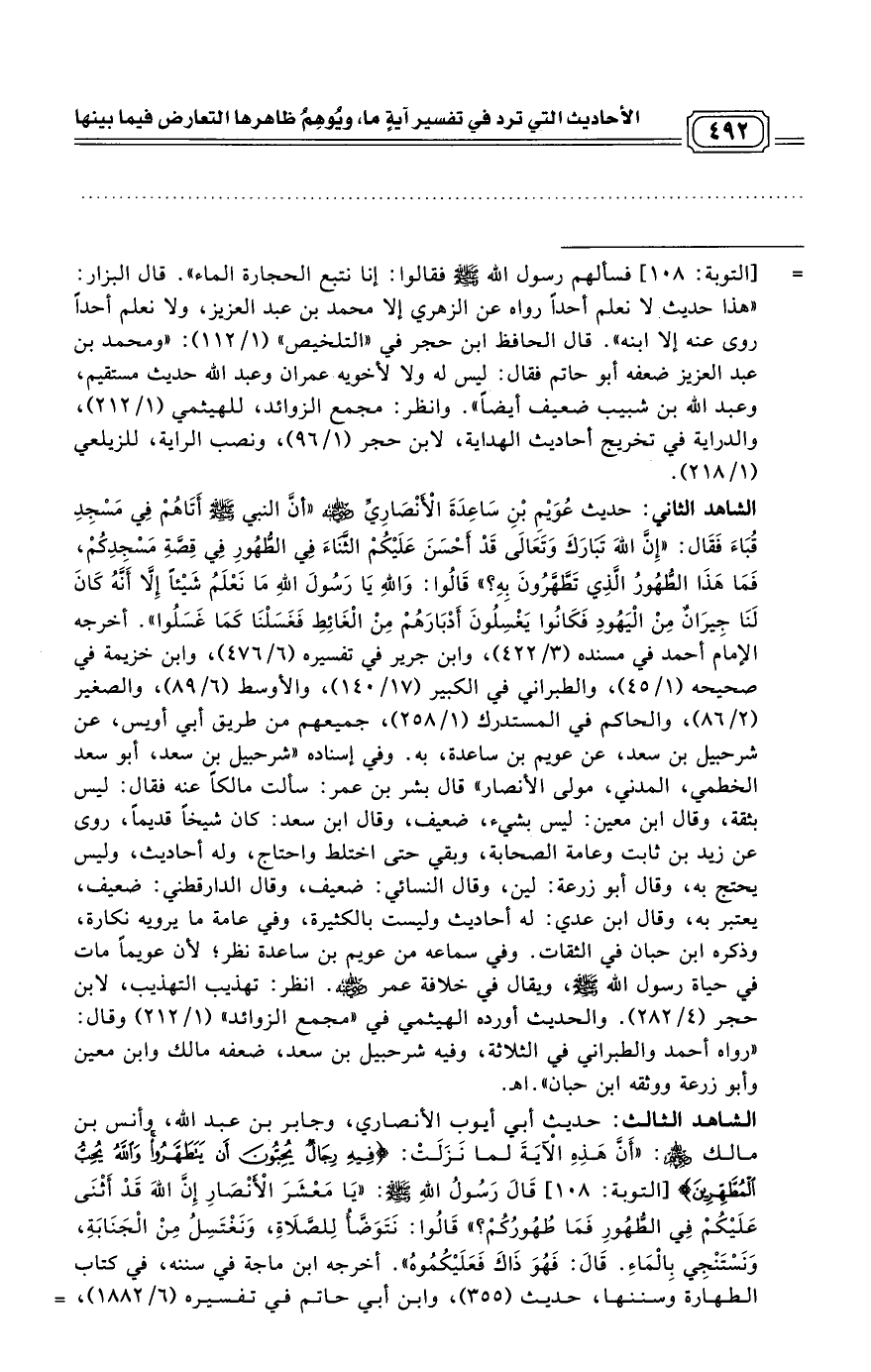 الشاهد الثاني: حديث عُوَيْمِ بْنِ سَاعِدَةَ الْأَنْصَارِيِّ - رضي الله عنه - أنَّ النبي - صلى الله عليه وسلم - أَتَاهُمْ فِي مَسْجِدِ قُبَاءَ فَقَال: «إِنَّ اللَّهَ تَبَارَكَ وَتَعَالَى قَدْ أَحْسَنَ عَلَيْكُمْ الثَّنَاءَ فِي الطُّهُورِ فِي قِصَّةِ مَسْجِدِكُمْ، فَمَا هَذَا الطُّهُورُ الَّذِي تَطَّهَّرُونَ بِهِ؟ قَالُوا: وَاللَّهِ يَا رَسُولَ اللَّهِ مَا نَعْلَمُ شَيْئًا إِلَّا أَنَّهُ كَانَ لَنَا جِيرَانٌ مِنْ الْيَهُودِ فَكَانُوا يَغْسِلُونَ أَدْبَارَهُمْ مِنْ الْغَائِطِ فَغَسَلْنَا كَمَا غَسَلُوا».