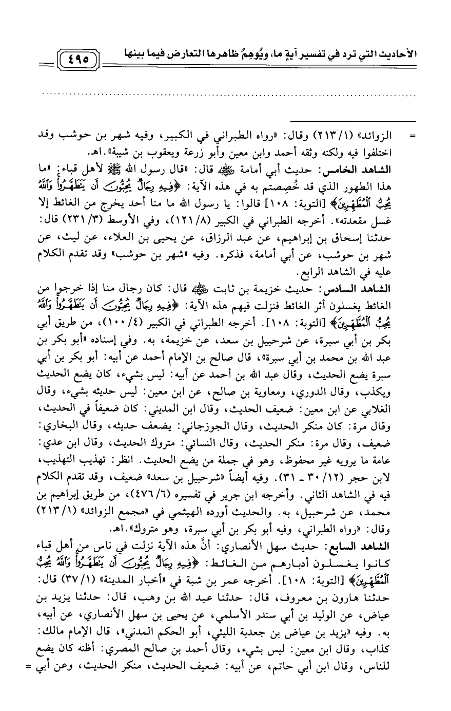 الشاهد السابع: حديث سهل الأنصاري: أنَّ هذه الآية نزلت في ناس من أهل قباء كانوا يغسلون أدبارهم من الغائط: (فِيهِ رِجَالٌ يُحِبُّونَ أَنْ يَتَطَهَّرُوا وَاللَّهُ يُحِبُّ الْمُطَّهِّرِينَ) [التوبة: 108].