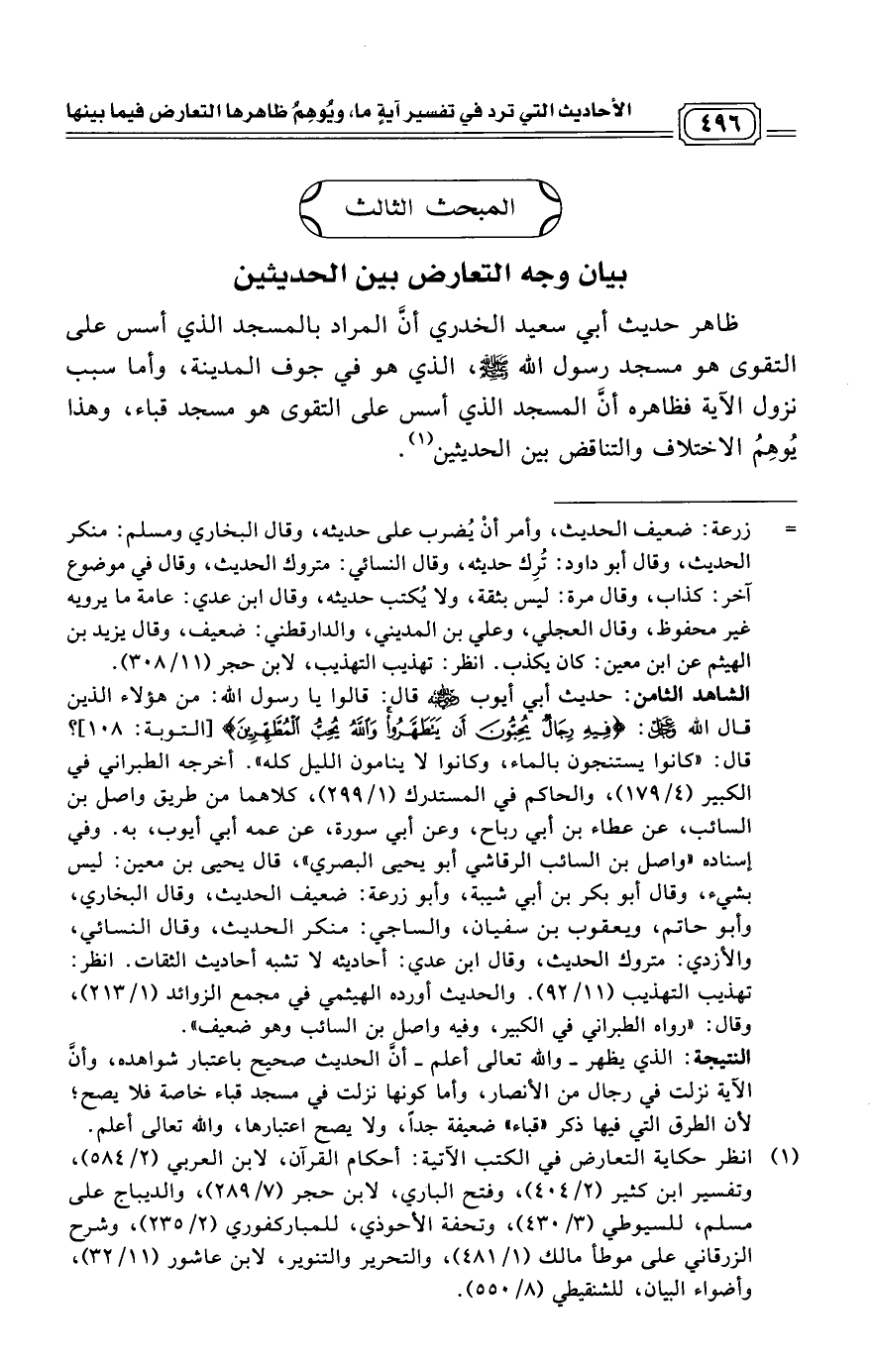 (¬1) انظر حكاية التعارض في الكتب الآتية: أحكام القرآن، لابن العربي (2/ 584)، وتفسير ابن كثير (2/ 404)، وفتح الباري، لابن حجر (7/ 289)، والديباج على مسلم، للسيوطي (3/ 430)، وتحفة الأحوذي، للمباركفوري (2/ 235)، وشرح الزرقاني على موطأ مالك (1/ 481)، والتحرير والتنوير، لابن عاشور (11/ 32)، وأضواء البيان، للشنقيطي (8/ 550).