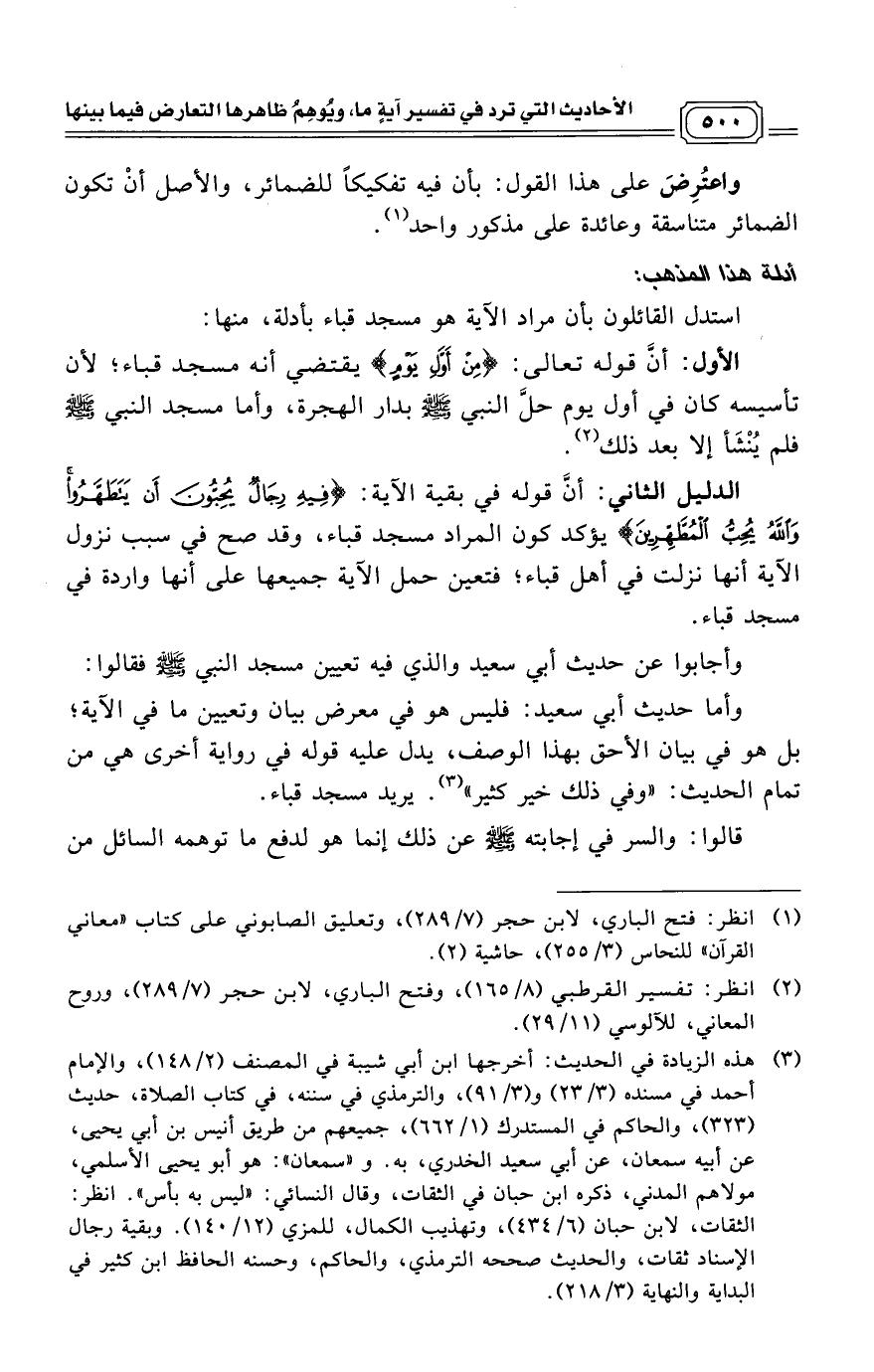 وأما حديث أبي سعيد: فليس هو في معرض بيان وتعيين ما في الآية؛ بل هو في بيان الأحق بهذا الوصف، يدل عليه قوله في رواية أخرى هي من تمام الحديث: «وفي ذلك خير كثير». (¬3) يريد مسجد قباء.