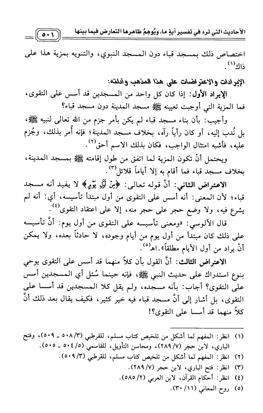 الاعتراض الثاني: أنَّ قوله تعالى: (مِنْ أَوَّلِ يَوْمٍ) لا يفيد أنه مسجد قباء؛ لأن المعنى: أنه أسس على التقوى من أول مبتدأ تأسيسه، أي أنه لم يشرع فيه، ولا وضع حجر على حجر منه، إلا على اعتقاد التقوى. (¬4)