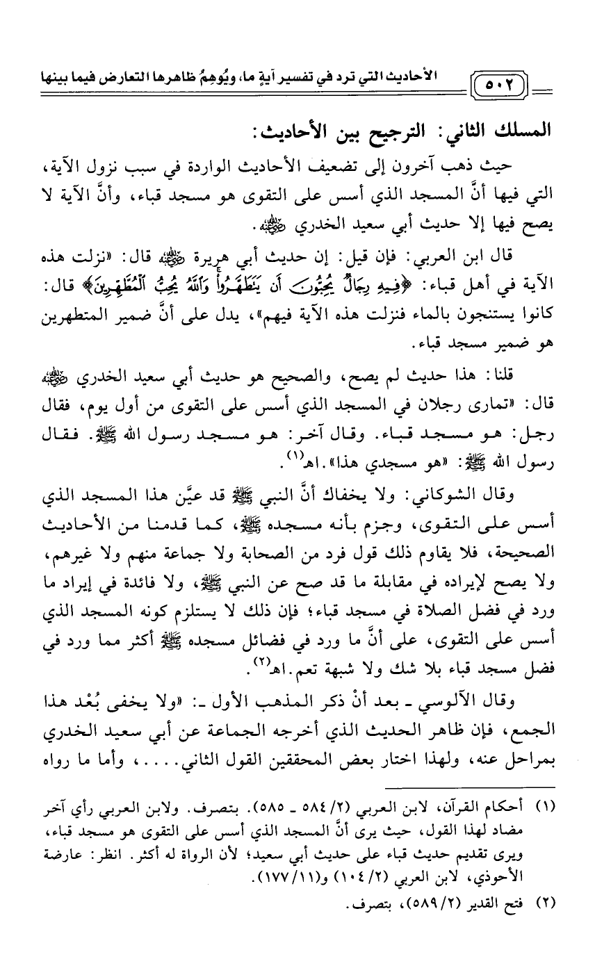 (¬1) أحكام القرآن، لابن العربي (2/ 584 - 585). بتصرف. ولابن العربي رأي آخر مضاد لهذا القول، حيث يرى أنَّ المسجد الذي أسس على التقوى هو مسجد قباء، ويرى تقديم حديث قباء على حديث أبي سعيد؛ لأن الرواة له أكثر. انظر: عارضة الأحوذي، لابن العربي (2/ 104) و (11/ 177).