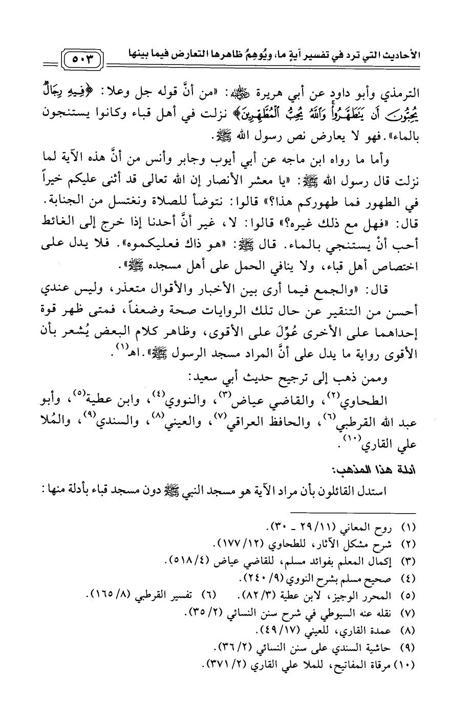 الترمذي وأبو داود عن أبي هريرة - رضي الله عنه -: «من أنَّ قوله جل وعلا: (فِيهِ رِجَالٌ يُحِبُّونَ أَنْ يَتَطَهَّرُوا وَاللَّهُ يُحِبُّ الْمُطَّهِّرِينَ) نزلت في أهل قباء وكانوا يستنجون بالماء». فهو لا يعارض نص رسول الله - صلى الله عليه وسلم -.