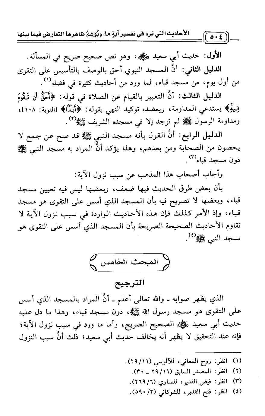 الدليل الرابع: أنَّ القول بأنه مسجد النبي - صلى الله عليه وسلم - قد صح عن جمع لا يحصون من الصحابة ومن بعدهم، وهذا يؤكد أنَّ المراد به مسجد النبي - صلى الله عليه وسلم - دون مسجد قباء. (¬3)