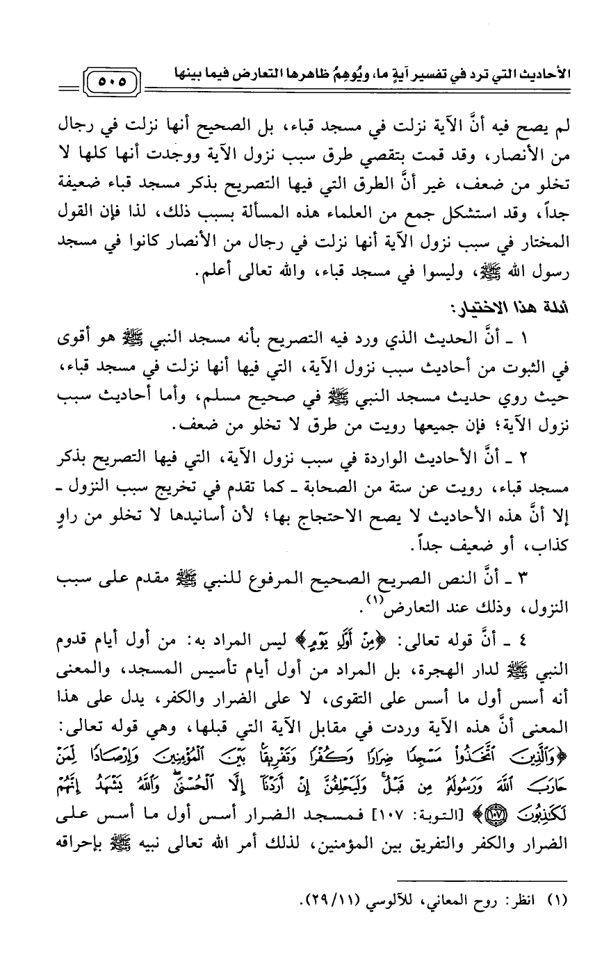 2 - أنَّ الأحاديث الواردة في سبب نزول الآية، التي فيها التصريح بذكر مسجد قباء، رويت عن ستة من الصحابة - كما تقدم في تخريج سبب النزول - إلا أنَّ هذه الأحاديث لا يصح الاحتجاج بها؛ لأن أسانيدها لا تخلو من راوٍ كذاب، أو ضعيف جداً.