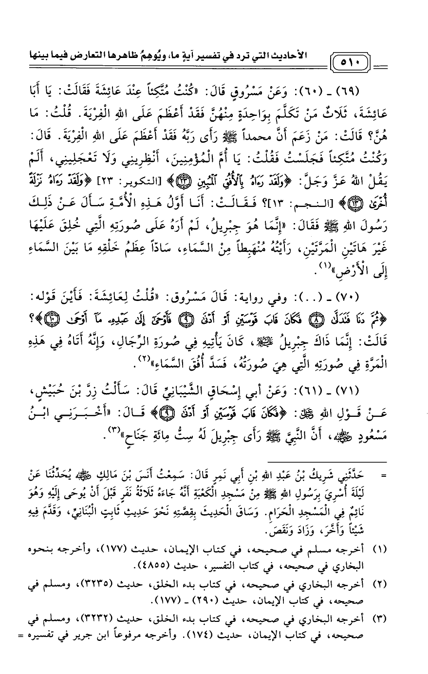 (69) ـ (60): وَعَنْ مَسْرُوقٍ قَالَ: «كُنْتُ مُتَّكِئًا عِنْدَ عَائِشَةَ فَقَالَتْ: يَا أَبَا عَائِشَةَ، ثَلَاثٌ مَنْ تَكَلَّمَ بِوَاحِدَةٍ مِنْهُنَّ فَقَدْ أَعْظَمَ عَلَى اللَّهِ الْفِرْيَةَ. قُلْتُ: مَا هُنَّ؟ قَالَتْ: مَنْ زَعَمَ أَنَّ محمداً - صلى الله عليه وسلم - رَأَى رَبَّهُ فَقَدْ أَعْظَمَ عَلَى اللَّهِ الْفِرْيَةَ. قَالَ: وَكُنْتُ مُتَّكِئًا فَجَلَسْتُ فَقُلْتُ: يَا أُمَّ الْمُؤْمِنِينَ، أَنْظِرِينِي وَلَا تَعْجَلِينِي، أَلَمْ يَقُلْ اللَّهُ عَزَّ وَجَلَّ: (وَلَقَدْ رَآهُ بِالْأُفُقِ الْمُبِينِ (23)) [التكوير: 23] (وَلَقَدْ رَآهُ نَزْلَةً أُخْرَى (13)) [النجم: 13]؟ فَقَالَتْ: أَنَا أَوَّلُ هَذِهِ الْأُمَّةِ سَأَلَ عَنْ ذَلِكَ رَسُولَ اللَّهِ - صلى الله عليه وسلم - فَقَالَ: «إِنَّمَا هُوَ جِبْرِيلُ، لَمْ أَرَهُ عَلَى صُورَتِهِ الَّتِي خُلِقَ عَلَيْهَا غَيْرَ هَاتَيْنِ الْمَرَّتَيْنِ، رَأَيْتُهُ مُنْهَبِطًا مِنْ السَّمَاءِ، سَادًّا عِظَمُ خَلْقِهِ مَا بَيْنَ السَّمَاءِ إِلَى الْأَرْضِ». (¬1)