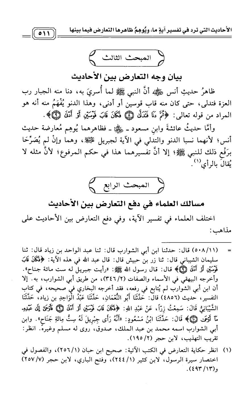 وأمَّا حديثُ عائشةَ وابنِ مسعود - رضي الله عنهما - فظاهرهما يُوهِم مُعارضة حديث أنس؛ لأنهما نسبا الدنو والتدلي في الآية لجبريل عليه السلام، وهما وإنْ لم يُصَرِّحَا برَفْعِ ذلك للنبي - صلى الله عليه وسلم -؛ إلا أنَّ تفسيرهما هذا في حكم المرفوع؛ لأنَّ مثله لا يُقال بالرأي. (¬1)