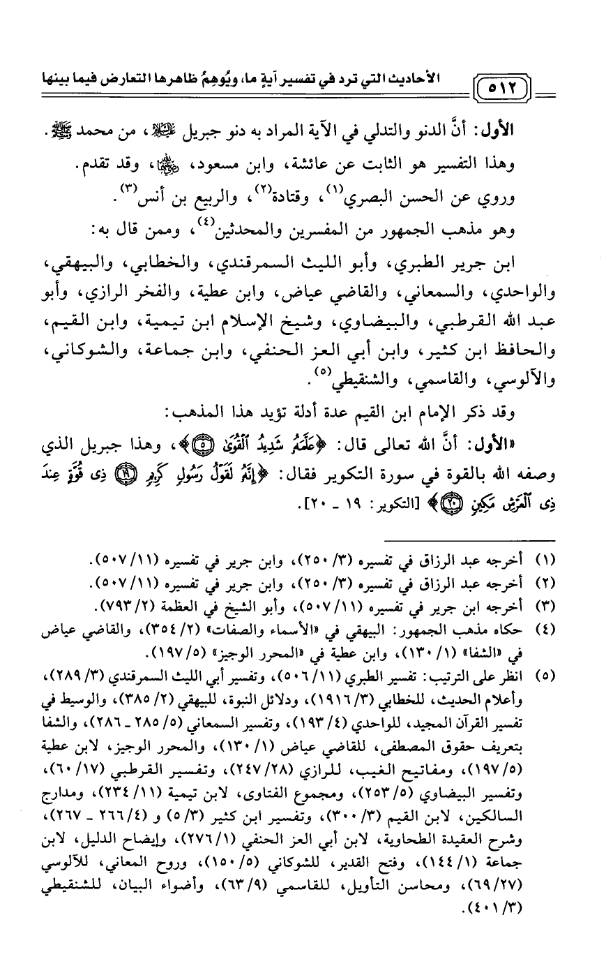 «الأول: أنَّ الله تعالى قال: (عَلَّمَهُ شَدِيدُ الْقُوَى (5)) [النجم: 5]، وهذا جبريل الذي وصفه الله بالقوة في سورة التكوير فقال: (إِنَّهُ لَقَوْلُ رَسُولٍ كَرِيمٍ (19) ذِي قُوَّةٍ عِنْدَ ذِي الْعَرْشِ مَكِينٍ (20)) [التكوير: 19 - 20].