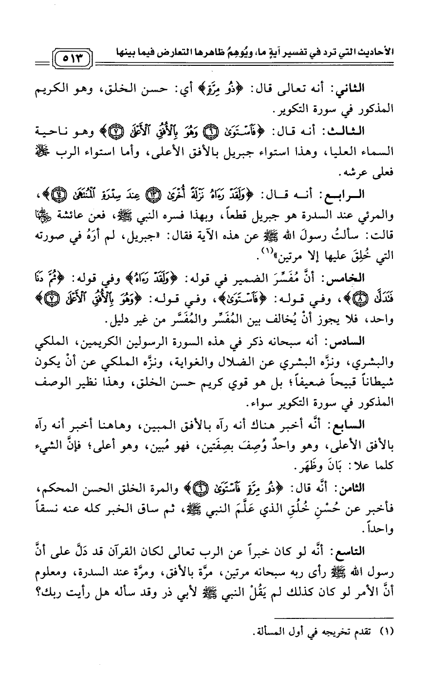 الخامس: أنَّ مُفَسِّرَ الضمير في قوله: (وَلَقَدْ رَآهُ) وفي قوله: (ثُمَّ دَنَا فَتَدَلَّى (8))، وفي قوله: (فَاسْتَوَى)، وفي قوله: (وَهُوَ بِالْأُفُقِ الْأَعْلَى (7)) واحد، فلا يجوز أنْ يُخالف بين المُفَسِّر والمُفَسَّر من غير دليل.