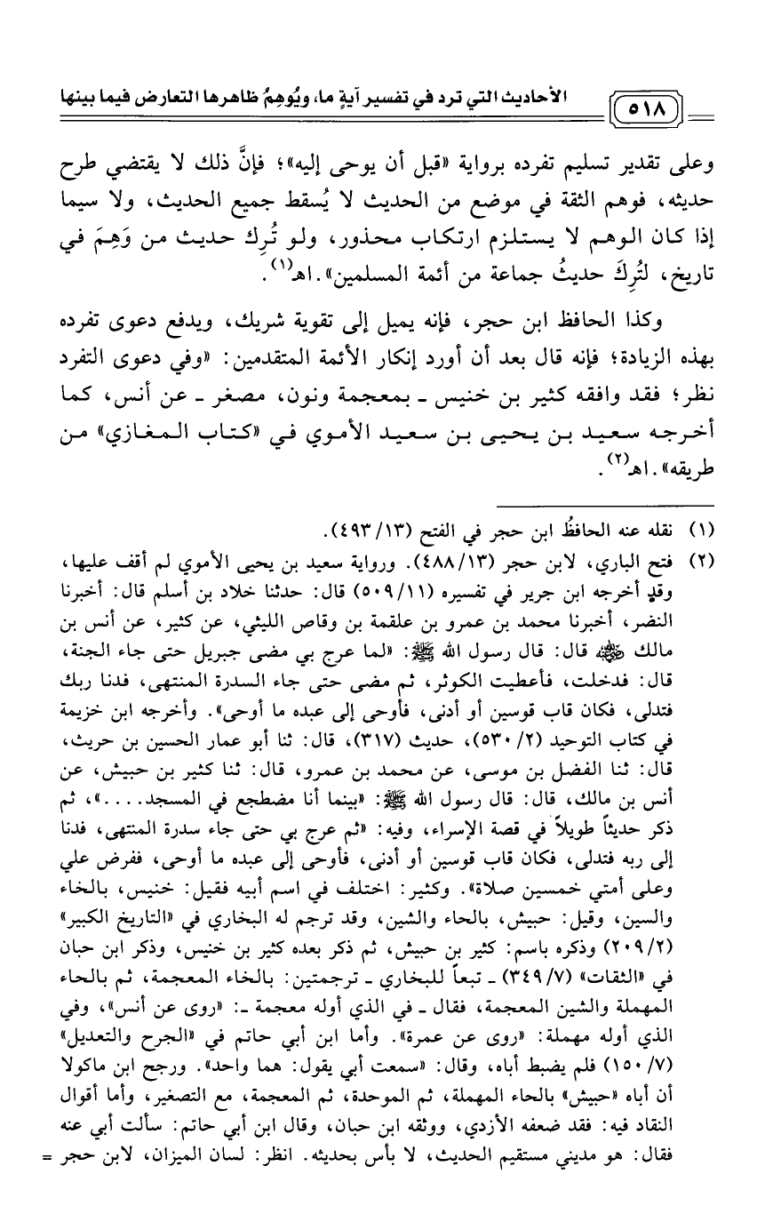 (¬2) فتح الباري، لابن حجر (13/ 488). ورواية سعيد بن يحيى الأموي لم أقف عليها، وقد أخرجه ابن جرير في تفسيره (11/ 509) قال: حدثنا خلاد بن أسلم قال: أخبرنا النضر، أخبرنا محمد بن عمرو بن علقمة بن وقاص الليثي، عن كثير، عن أنس بن مالك - رضي الله عنه - قال: قال رسول الله - صلى الله عليه وسلم -: «لما عرج بي مضى جبريل حتى جاء الجنة، قال: فدخلت، فأعطيت الكوثر، ثم مضى حتى جاء السدرة المنتهى، فدنا ربك فتدلى، فكان قاب قوسين أو أدنى، فأوحى إلى عبده ما أوحى».