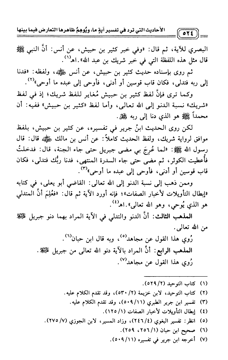 وممن ذهب إلى نسبة الدنو إلى الله تعالى: القاضي أبو يعلى، في كتابه «إبطال التأويلات لأخبار الصفات»؛ فإنه أورد الآية ثم قال: «فعُلِمَ أنَّ المتدلي هو الذي يُوحي، وهو الله تعالى». اهـ (¬4)