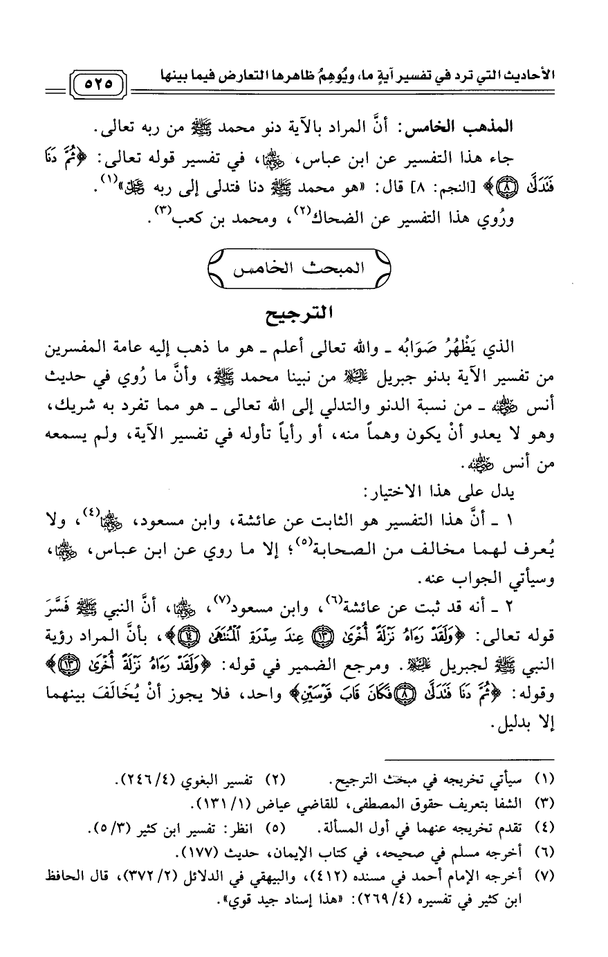 2 - أنه قد ثبت عن عائشة (¬6)، وابن مسعود (¬7)، رضي الله عنهما، أنَّ النبي - صلى الله عليه وسلم - فَسَّرَ قوله تعالى: (وَلَقَدْ رَآهُ نَزْلَةً أُخْرَى (13) عِنْدَ سِدْرَةِ الْمُنْتَهَى (14))، بأنَّ المراد رؤية النبي - صلى الله عليه وسلم - لجبريل عليه السلام. ومرجع الضمير في قوله: (وَلَقَدْ رَآهُ نَزْلَةً أُخْرَى (13)) وقوله: (ثُمَّ دَنَا فَتَدَلَّى (8) فَكَانَ قَابَ قَوْسَيْنِ) واحد، فلا يجوز أنْ يُخَالَفَ بينهما إلا بدليل.