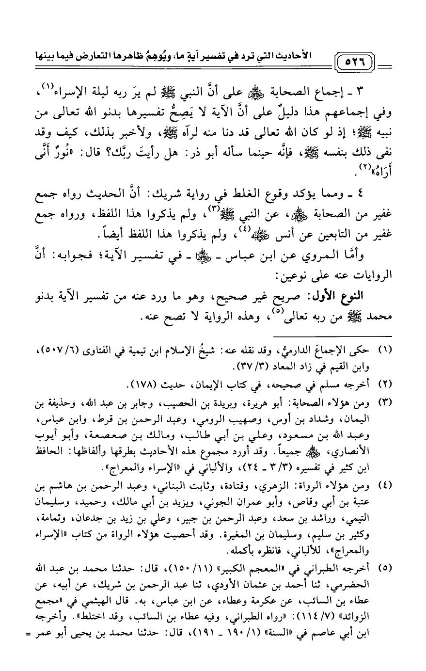3 - إجماع الصحابة - رضي الله عنهم - على أنَّ النبي - صلى الله عليه وسلم - لم يرَ ربه ليلة الإسراء (¬1)، وفي إجماعهم هذا دليلٌ على أنَّ الآية لا يَصِحُّ تفسيرها بدنو الله تعالى من نبيه - صلى الله عليه وسلم -؛ إذ لو كان الله تعالى قد دنا منه لرآه - صلى الله عليه وسلم -، ولأخبر بذلك، كيف وقد نفى ذلك بنفسه - صلى الله عليه وسلم -، فإنَّه حينما سأله أبو ذر: هل رأيتَ ربَّك؟ قال: «نُورٌ أَنَّى أَرَاهُ» (¬2).