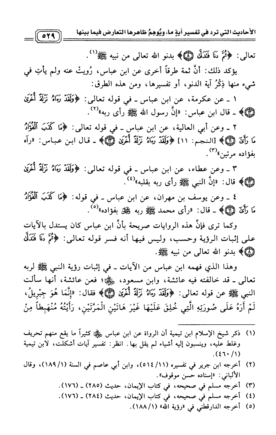 وكما ترى فإنَّ هذه الروايات صريحة بأنَّ ابن عباس كان يستدل بالآيات على إثبات الرؤية وحسب، وليس فيها أنه فسر قوله تعالى: (ثُمَّ دَنَا فَتَدَلَّى (8)) بدنو الله تعالى من نبيه صلى الله عليه وسلم.