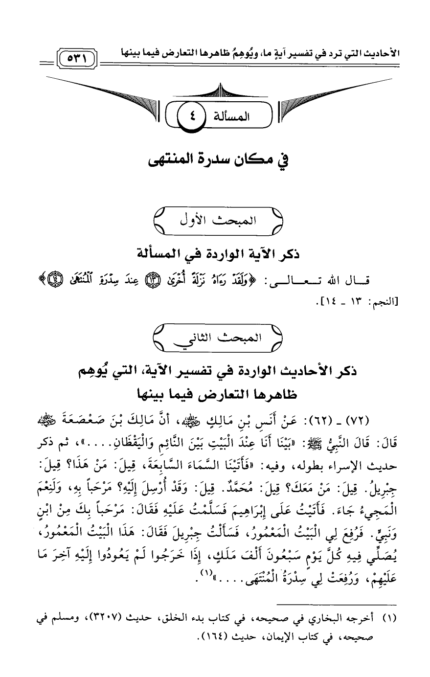 (72) ـ (62): عَنْ أَنَسِ بْنِ مَالِكٍ - رضي الله عنه -، أنَّ مَالِكَ بْنَ صَعْصَعَةَ - رضي الله عنه - قَالَ: قَالَ النَّبِيُّ صَلَّى اللَّهُ عَلَيْهِ وَسَلَّمَ: «بَيْنَا أَنَا عِنْدَ الْبَيْتِ بَيْنَ النَّائِمِ وَالْيَقْظَانِ .... »، ثم ذكر حديث الإسراء بطوله، وفيه: «فَأَتَيْنَا السَّمَاءَ السَّابِعَةَ، قِيلَ: مَنْ هَذَا؟ قِيلَ: جِبْرِيلُ. قِيلَ: مَنْ مَعَكَ؟ قِيلَ: مُحَمَّدٌ. قِيلَ: وَقَدْ أُرْسِلَ إِلَيْهِ؟ مَرْحَبًا بِهِ، وَلَنِعْمَ الْمَجِيءُ جَاءَ. فَأَتَيْتُ عَلَى إِبْرَاهِيمَ فَسَلَّمْتُ عَلَيْهِ فَقَالَ: مَرْحَبًا بِكَ مِنْ ابْنٍ وَنَبِيٍّ. فَرُفِعَ لِي الْبَيْتُ الْمَعْمُورُ، فَسَأَلْتُ جِبْرِيلَ فَقَالَ: هَذَا الْبَيْتُ الْمَعْمُورُ، يُصَلِّي فِيهِ كُلَّ يَوْمٍ سَبْعُونَ أَلْفَ مَلَكٍ، إِذَا خَرَجُوا لَمْ يَعُودُوا إِلَيْهِ آخِرَ مَا عَلَيْهِمْ، وَرُفِعَتْ لِي سِدْرَةُ الْمُنْتَهَى .... ». (¬1)