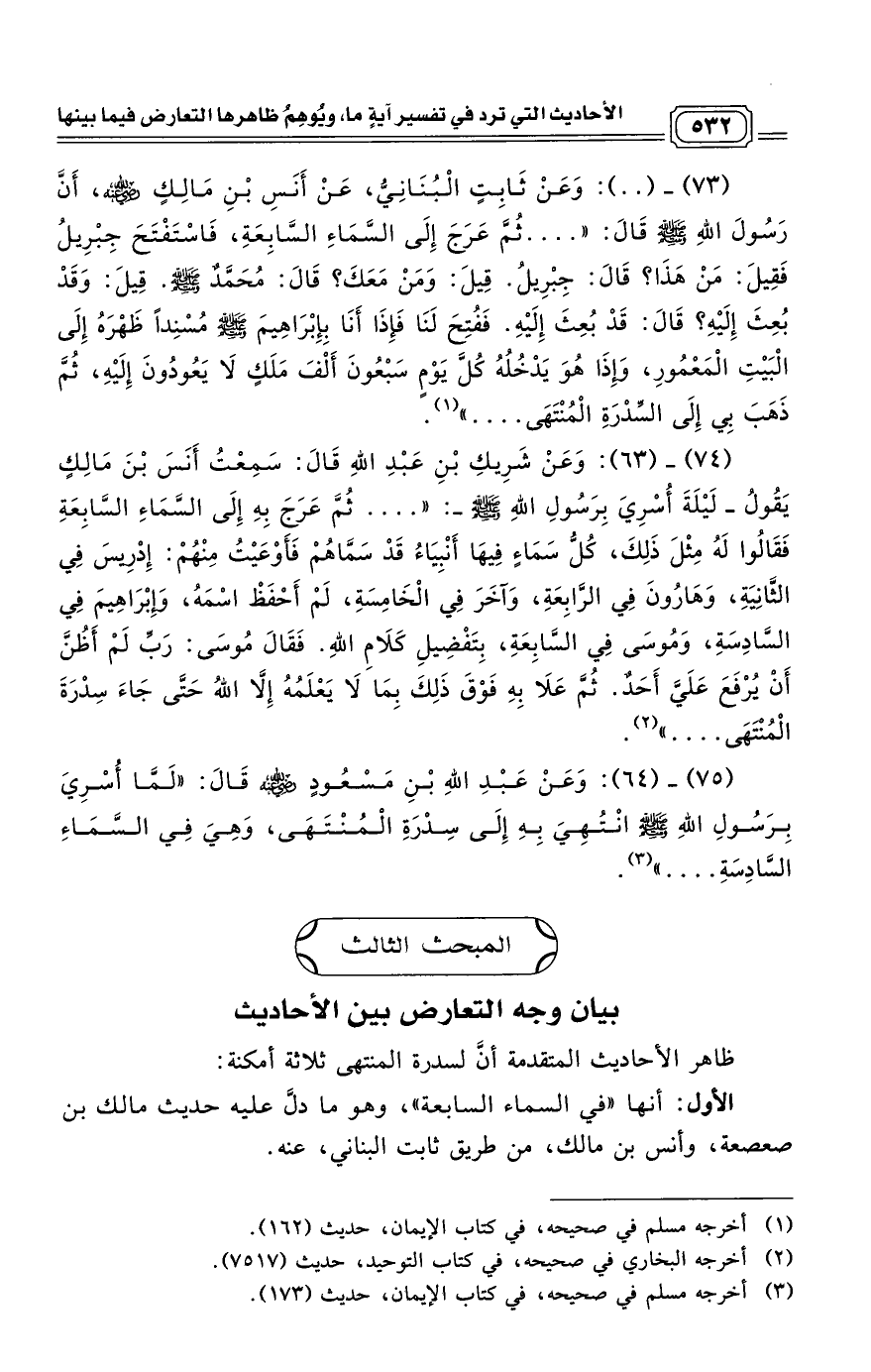 (75) ـ (64): وَعَنْ عَبْدِ اللَّهِ بْنِ مَسْعُودٍ رَضِيَ اللَّهُ عَنْه قَالَ: «لَمَّا أُسْرِيَ بِرَسُولِ اللَّهِ صَلَّى اللَّهُ عَلَيْهِ وَسَلَّمَ انْتُهِيَ بِهِ إِلَى سِدْرَةِ الْمُنْتَهَى، وَهِيَ فِي السَّمَاءِ السَّادِسَةِ .... ». (¬3)