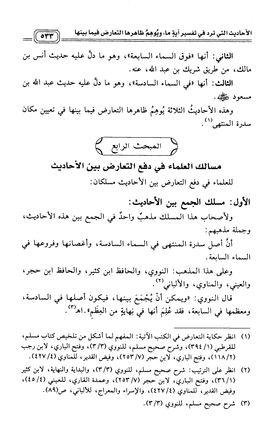 وهذه الأحاديثُ الثلاثة يُوهِمُ ظاهرها التعارض فيما بينها في تعيين مكان سدرة المنتهى. (¬1)