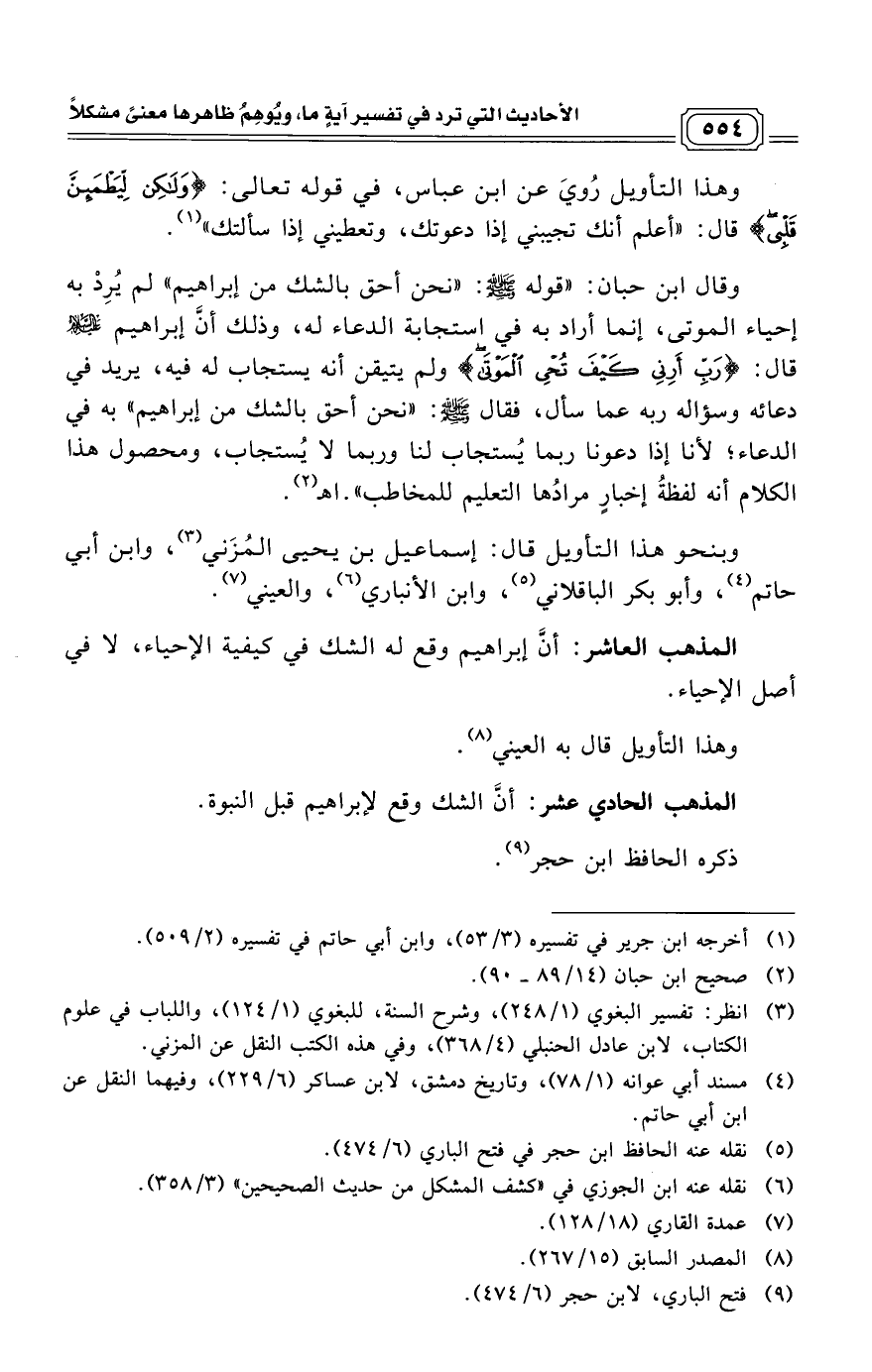 وقال ابن حبان: «قوله - صلى الله عليه وسلم -: «نحن أحق بالشك من إبراهيم» لم يُرِدْ به إحياء الموتى، إنما أراد به في استجابة الدعاء له، وذلك أنَّ إبراهيم عليه السلام قال: (رَبِّ أَرِنِي كَيْفَ تُحْيِ الْمَوْتَى) ولم يتيقن أنه يستجاب له فيه، يريد في دعائه وسؤاله ربه عما سأل، فقال - صلى الله عليه وسلم -: «نحن أحق بالشك من إبراهيم» به في الدعاء؛ لأنا إذا دعونا ربما يُستجاب لنا وربما لا يُستجاب، ومحصول هذا الكلام أنه لفظةُ إخبارٍ مرادُها التعليم للمخاطب». اهـ (¬2)