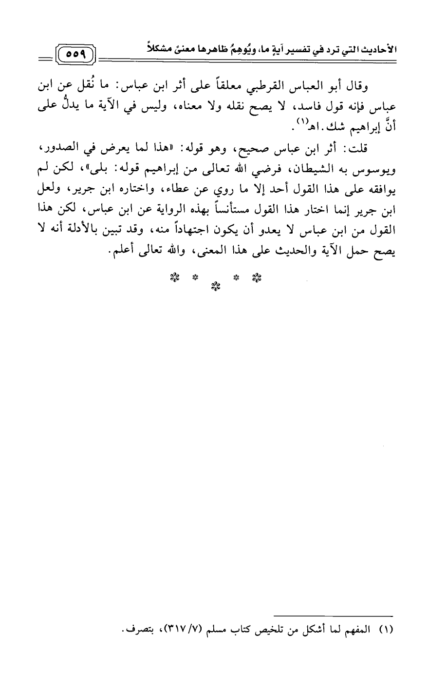 وقال أبو العباس القرطبي معلقاً على أثر ابن عباس: ما نُقل عن ابن عباس فإنه قول فاسد، لا يصح نقله ولا معناه، وليس في الآية ما يدلُّ على أنَّ إبراهيم شك. اهـ (¬1)