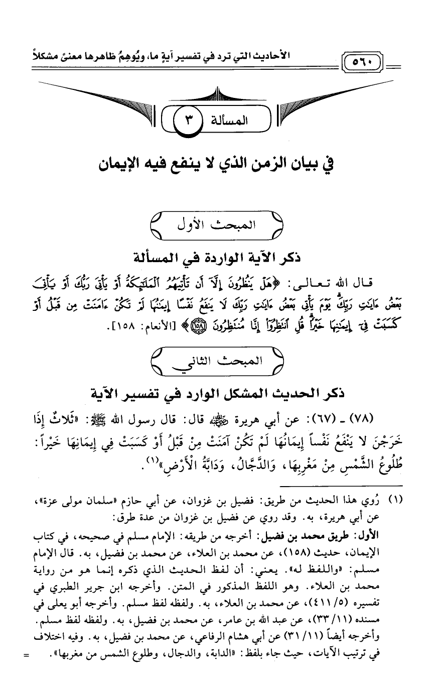 (78) ـ (67): عن أبي هريرة - رضي الله عنه - قال: قال رسول الله - صلى الله عليه وسلم -: «ثَلاثٌ إِذَا خَرَجْنَ لا يَنْفَعُ نَفْسًا إِيمَانُهَا لَمْ تَكُنْ آمَنَتْ مِنْ قَبْلُ أَوْ كَسَبَتْ فِي إِيمَانِهَا خَيْرًا: طُلُوعُ الشَّمْسِ مِنْ مَغْرِبِهَا، وَالدَّجَّالُ، وَدَابَّةُ الْأَرْضِ». (¬1)