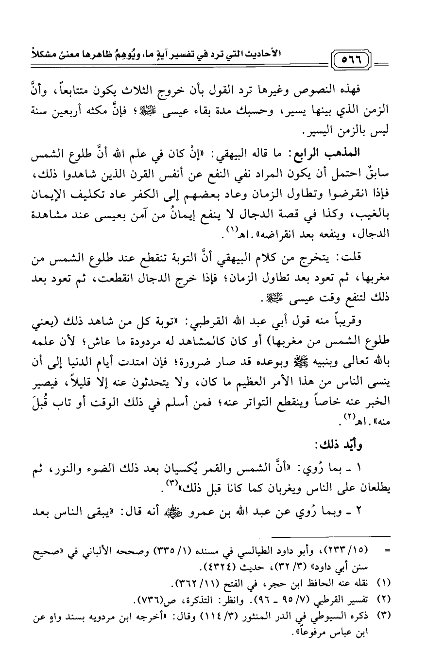 المذهب الرابع: ما قاله البيهقي: «إنْ كان في علم الله أنَّ طلوع الشمس سابقٌ احتمل أن يكون المراد نفى النفع عن أنفس القرن الذين شاهدوا ذلك، فإذا انقرضوا وتطاول الزمان وعاد بعضهم إلى الكفر عاد تكليف الإيمان بالغيب، وكذا في قصة الدجال لا ينفع إيمانُ من آمن بعيسى عند مشاهدة الدجال، وينفعه بعد انقراضه». اهـ (¬1)