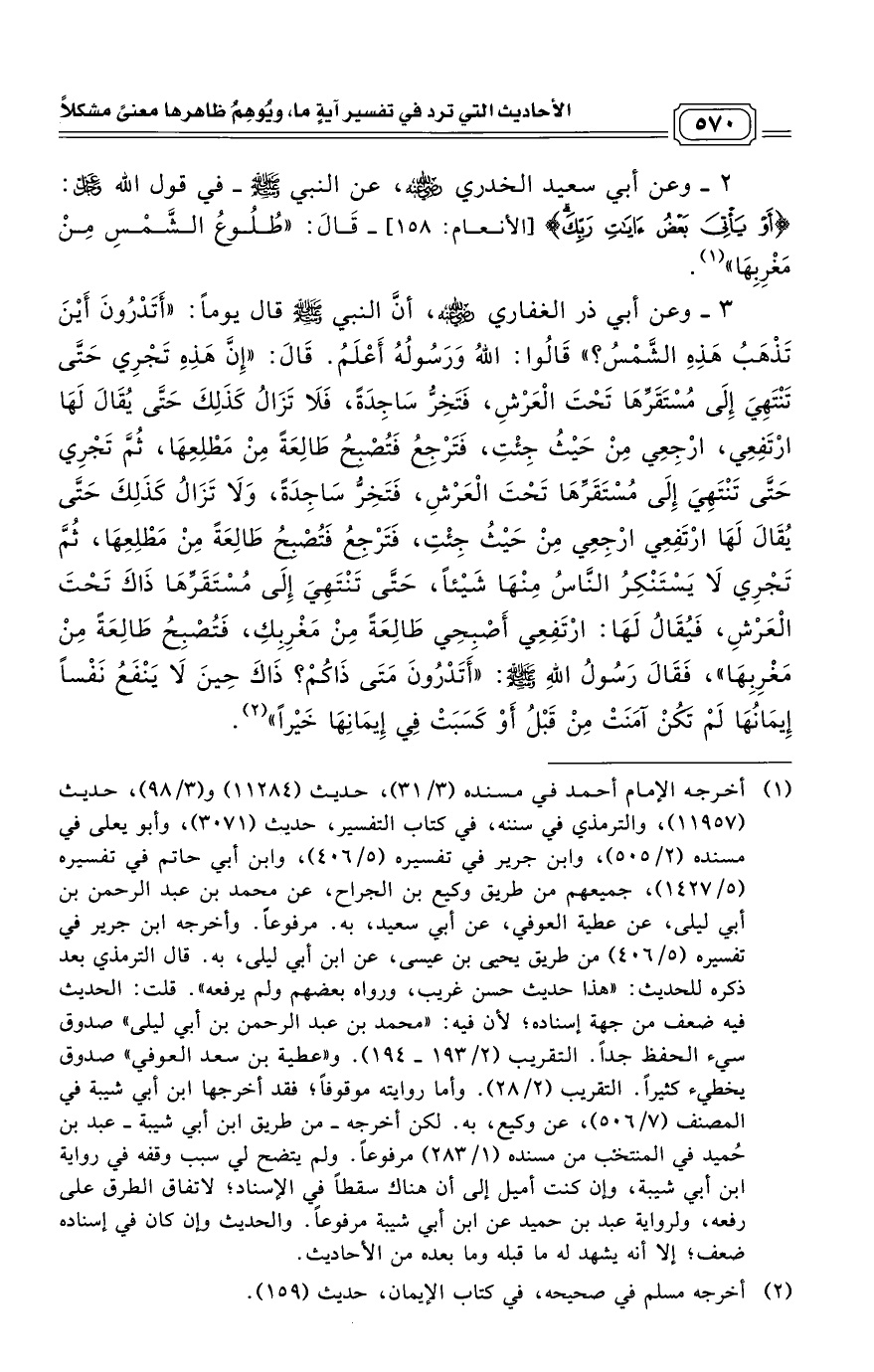 2 - وعن أبي سعيد الخدري - رضي الله عنه -، عن النبي - صلى الله عليه وسلم - ـ في قول الله عز وجل ـ: (أَوْ يَأْتِيَ بَعْضُ آيَاتِ رَبِّكَ) [الأنعام: 158] قَالَ: «طُلُوعُ الشَّمْسِ مِنْ مَغْرِبِهَا». (¬1)