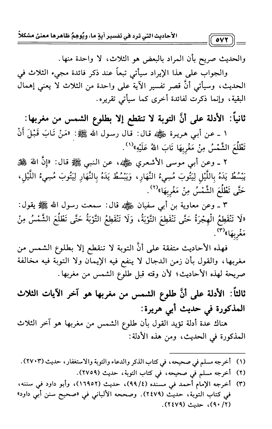 ثالثاً: الأدلة على أنَّ طلوع الشمس من مغربها هو آخر الآيات الثلاث المذكورة في حديث أبي هريرة.