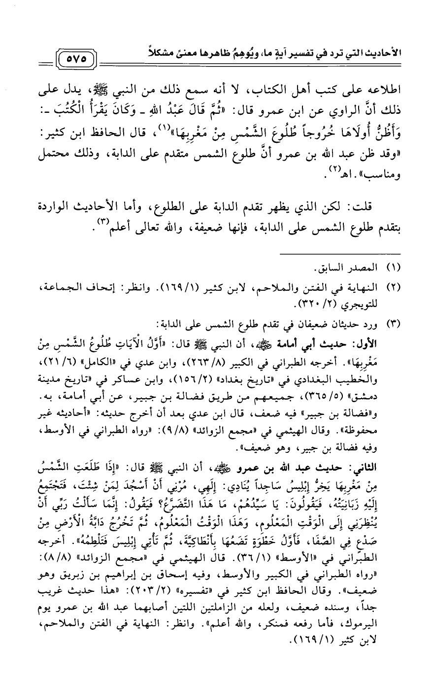 قلت: لكن الذي يظهر تقدم الدابة على الطلوع، وأما الأحاديث الواردة بتقدم طلوع الشمس على الدابة، فإنها ضعيفة، والله تعالى أعلم. (¬3)