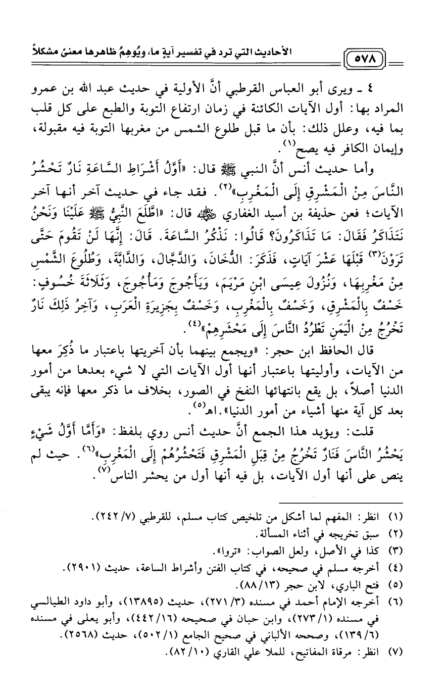 4 - ويرى أبو العباس القرطبي أنَّ الأولية في حديث عبد الله بن عمرو المراد بها: أول الآيات الكائنة في زمان ارتفاع التوبة والطبع على كل قلب بما فيه، وعلل ذلك: بأن ما قبل طلوع الشمس من مغربها التوبة فيه مقبولة، وإيمان الكافر فيه يصح. (¬1)