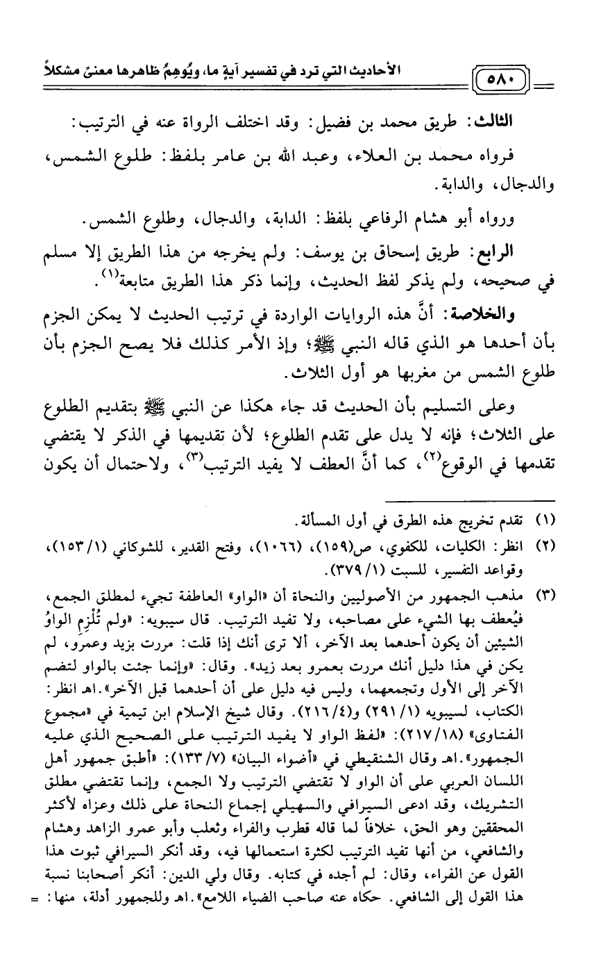(¬3) مذهب الجمهور من الأصوليين والنحاة أن «الواو» العاطفة تجيء لمطلق الجمع، فيُعطف بها الشيء على مصاحبه، ولا تفيد الترتيب. قال سيبويه: «ولم تُلْزِمِ الواوُ الشيئين أن يكون أحدهما بعد الآخر، ألا ترى أنك إذا قلت: مررت بزيد وعمرو، لم يكن في هذا دليل أنك مررت بعمرو بعد زيد».