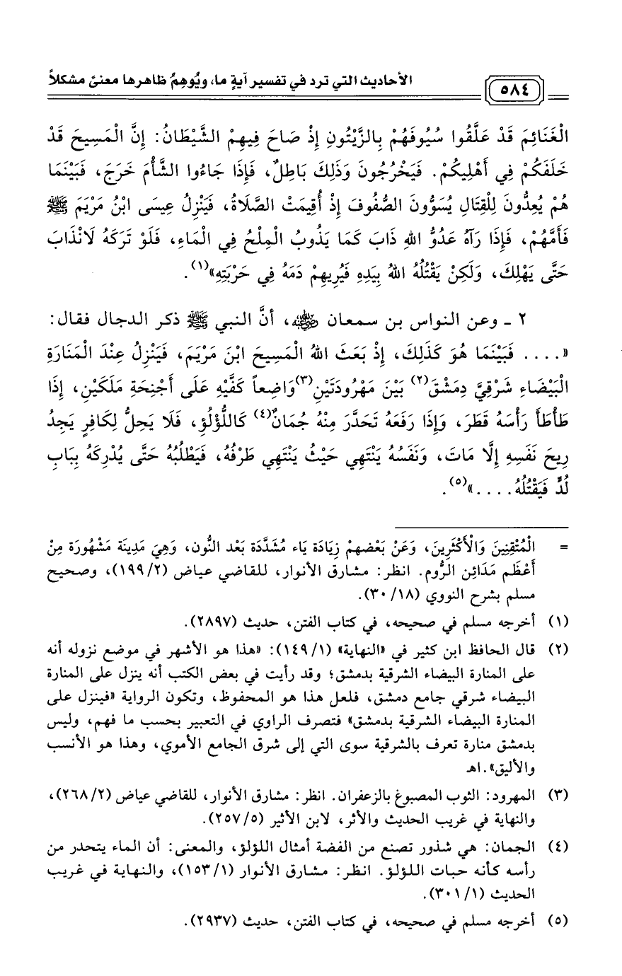 (¬2) قال الحافظ ابن كثير في «النهاية» (1/ 149): «هذا هو الأشهر في موضع نزوله أنه على المنارة البيضاء الشرقية بدمشق؛ وقد رأيت في بعض الكتب أنه ينزل على المنارة البيضاء شرقي جامع دمشق، فلعل هذا هو المحفوظ، وتكون الرواية «فينزل على المنارة البيضاء الشرقية بدمشق» فتصرف الراوي في التعبير بحسب ما فهم، وليس بدمشق منارة تعرف بالشرقية سوى التي إلى شرق الجامع الأموي، وهذا هو الأنسب والأليق». اهـ