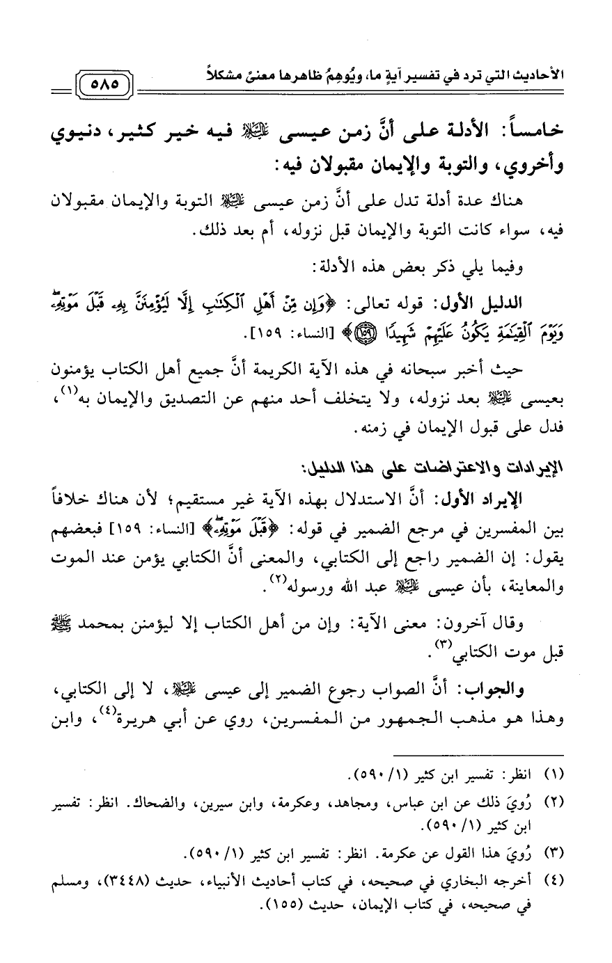 الإيراد الأول: أنَّ الاستدلال بهذه الآية غير مستقيم؛ لأن هناك خلافاً بين المفسرين في مرجع الضمير في قوله: (قَبْلَ مَوْتِهِ) [النساء: 159] فبعضهم يقول: إن الضمير راجع إلى الكتابي، والمعنى أنَّ الكتابي يؤمن عند الموت والمعاينة، بأن عيسى عليه السلام عبد الله ورسوله. (¬2)