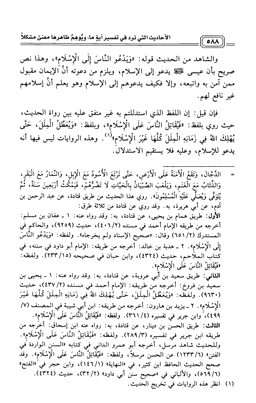2 - هدبة بن خالد: أخرجه من طريقه الإمام أبي داود في سننه، في كتاب الملاحم، حديث (4324)، وابن حبان في صحيحه (15/ 233). ولفظه: «فَيُقَاتِلُ النَّاسَ عَلَى الْإِسْلَامِ».