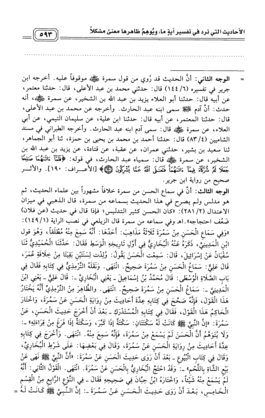 الوجه الثالث: أنَّ في سماع الحسن من سمرة خلافاً مشهوراً بين علماء الحديث، ثم هو مدلس ولم يصرح في هذا الحديث بسماعه من سمرة، قال الذهبي في ميزان الاعتدال (2/ 281): «كان الحسن كثير التدليس؛ فإذا قال في حديث (عن فلان) ضَعُف احتجاجه». اهـ وفي سماعه من سمرة قال الزيلعي في نصب الراية (1/ 149): «وَفِي سَمَاعِ الْحَسَنِ مِنْ سَمُرَةَ ثَلَاثَةُ مَذَاهِبَ: أَحَدُهَا: أَنَّهُ سَمِعَ مِنْهُ مُطْلَقًا، وَهُوَ قول ابْنِ الْمَدِينِيِّ، ذَكَرَهُ عَنْهُ الْبُخَارِيُّ فِي أَوَّلِ تَارِيخِهِ الْوَسَطِ فَقَالَ: حَدَّثَنَا الْحُمَيْدِيُّ ثَنَا سُفْيَانُ عَنْ إسْرَائِيلَ، قَالَ: سَمِعْت الْحَسَنَ يَقُولُ: وُلِدْت لِسَنَتَيْنِ بَقِيَتَا مِنْ خِلَافَةِ عُمَرَ، قَالَ عَلِيٌّ: سَمَاعُ الْحَسَنِ مِنْ سَمُرَةَ صَحِيحٌ. انْتَهَى. وَنَقَلَهُ التِّرْمِذِيُّ فِي كِتَابِهِ فَقَالَ فِي بَابِ الصَّلَاةِ الْوُسْطَى: قَالَ مُحَمَّدُ بْنُ إسْمَاعِيلَ - يَعْنِي الْبُخَارِيَّ -: قَالَ عَلِيٌّ - يَعْنِي ابْنَ الْمَدِينِيَّ -: سَمَاعُ الْحَسَنِ مِنْ سَمُرَةَ صَحِيحٌ. انْتَهَى. والظَّاهِرَ مِنْ التِّرْمِذِيِّ أَنَّهُ يَخْتَارُ هَذَا الْقَوْلَ، فَإِنَّهُ صَحَّحَ فِي كِتَابِهِ عِدَّةَ أَحَادِيثَ مِنْ رِوَايَةِ الْحَسَنِ عَنْ سَمُرَةَ، وَاخْتَارَ الْحَاكِمُ هَذَا الْقَوْلَ، فَقَالَ فِي كِتَابِهِ الْمُسْتَدْرَكِ - بَعْدَ أَنْ أَخْرَجَ حَدِيثَ الْحَسَنِ، عَنْ سَمُرَةَ: «إنَّ النَّبِيَّ - صلى الله عليه وسلم - كَانَتْ لَهُ سَكْتَتَانِ: سَكْتَةٌ إذَا كَبَّرَ، وَسَكْتَةٌ إذَا فَرَغَ مِنْ قِرَاءَتِهِ»، وَلَا يُتَوَهَّمُ أَنَّ الْحَسَنَ لَمْ يَسْمَعْ مِنْ سَمُرَةَ، فَإِنَّهُ سَمِعَ مِنْهُ. انْتَهَى. وَأَخْرَجَ فِي كِتَابِهِ عِدَّةَ أَحَادِيثَ مِنْ رِوَايَةِ الْحَسَنِ عَنْ سَمُرَةَ، وَقَالَ فِي بَعْضِهَا: عَلَى شَرْطِ الْبُخَارِيِّ، وَقَالَ فِي كِتَابِ الْبُيُوعِ بَعْدَ أَنْ رَوَى حَدِيثَ الْحَسَنِ عَنْ سَمُرَةَ: «أَنَّ النَّبِيَّ - صلى الله عليه وسلم - نَهَى عَنْ بَيْعِ الشَّاةِ بِاللَّحْمِ»، وَقَدْ احْتَجَّ الْبُخَارِيُّ بِالْحَسَنِ عَنْ سَمُرَةَ. انْتَهَى. الْقَوْلُ الثَّانِي: أَنَّهُ لَمْ يَسْمَعْ مِنْهُ شَيْئًا، وَاخْتَارَهُ ابْنُ حِبَّانَ فِي صَحِيحِهِ فَقَالَ فِي النَّوْعِ الرَّابِعِ مِنْ الْقِسْمِ الْخَامِسِ، بَعْدَ أَنْ رَوَى حَدِيثَ الْحَسَنِ عَنْ سَمُرَةَ: إنَّ النَّبِيَّ - صلى الله عليه وسلم - كَانَتْ لَهُ =
