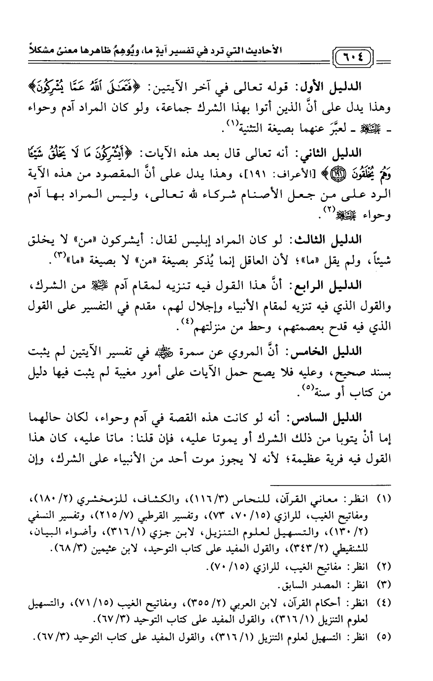 الدليل الرابع: أنَّ هذا القول فيه تنزيه لمقام آدم - عليه السلام - من الشرك، والقول الذي فيه تنزيه لمقام الأنبياء وإجلال لمقامهم، مقدم في التفسير على القول الذي فيه قدح بعصمتهم، وحط من منزلتهم. (¬4)