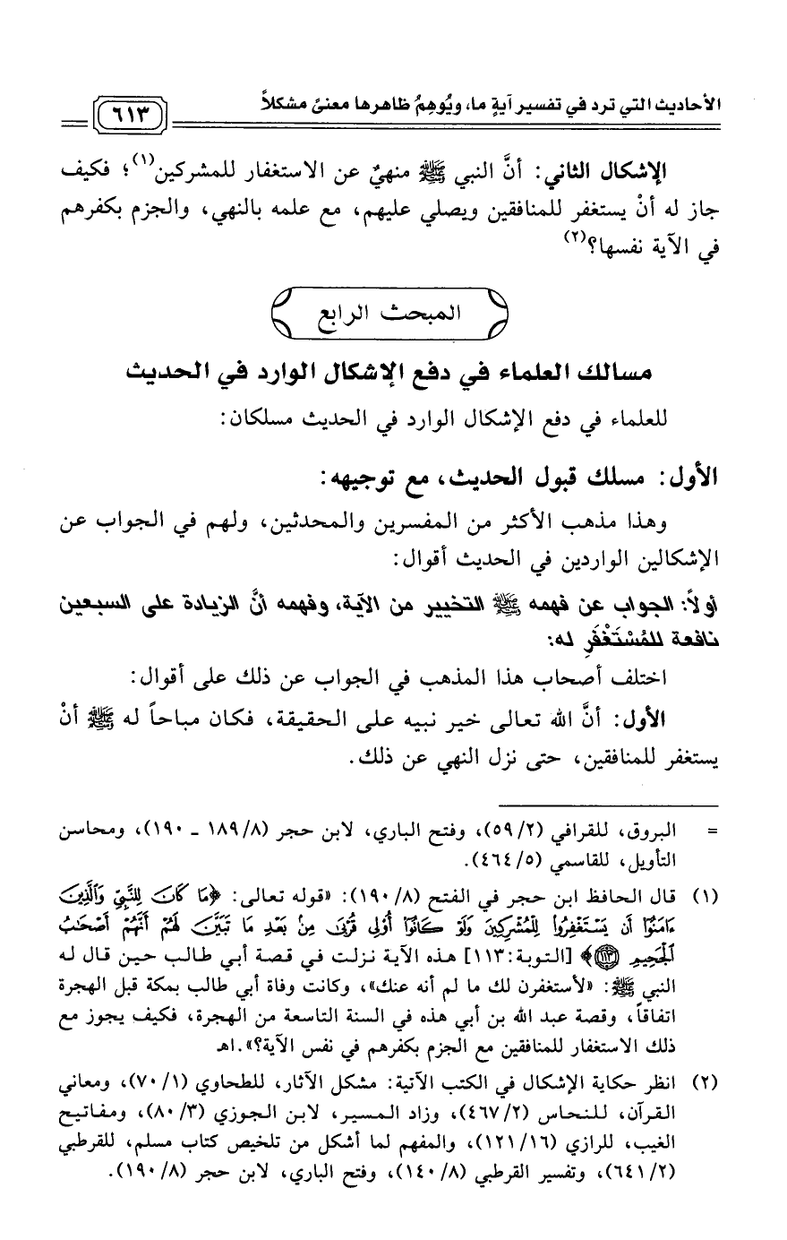 (¬1) قال الحافظ ابن حجر في الفتح (8/ 190): «قوله تعالى: (مَا كَانَ لِلنَّبِيِّ وَالَّذِينَ آمَنُواْ أَن يَسْتَغْفِرُواْ لِلْمُشْرِكِينَ وَلَوْ كَانُواْ أُوْلِي قُرْبَى مِن بَعْدِ مَا تَبَيَّنَ لَهُمْ أَنَّهُمْ أَصْحَابُ الْجَحِيمِ (113)) [التوبة: 113] هذه الآية نزلت في قصة أبي طالب حين قال له النبي - صلى الله عليه وسلم -: «لأستغفرن لك ما لم أنه عنك»، وكانت وفاة أبي طالب بمكة قبل الهجرة اتفاقاً، وقصة عبد الله بن أبي هذه في السنة التاسعة من الهجرة، فكيف يجوز مع ذلك الاستغفار للمنافقين مع الجزم بكفرهم في نفس الآية؟ ». اهـ